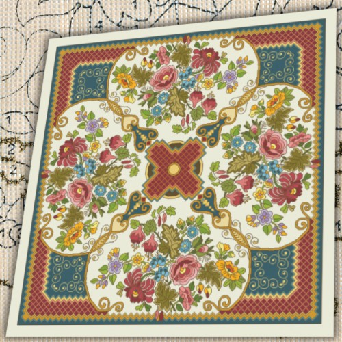 Δίνει: τραπεζοκαρέ 1,20 Χ 1,20 μ. Το κέντημα: 1,10 Χ 1,10 μ.